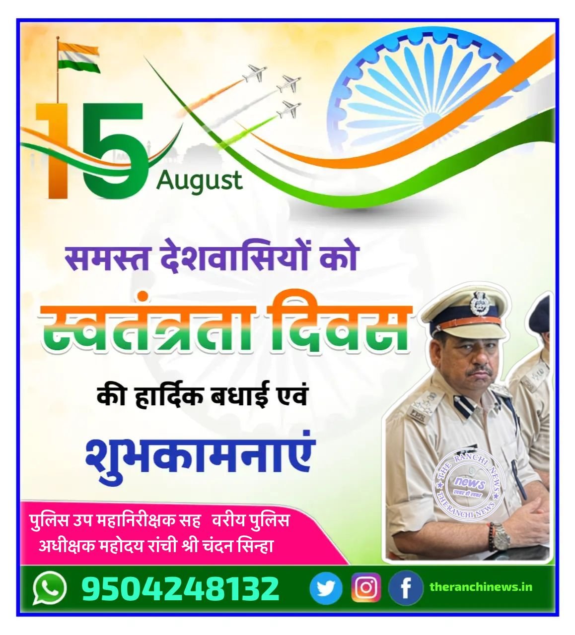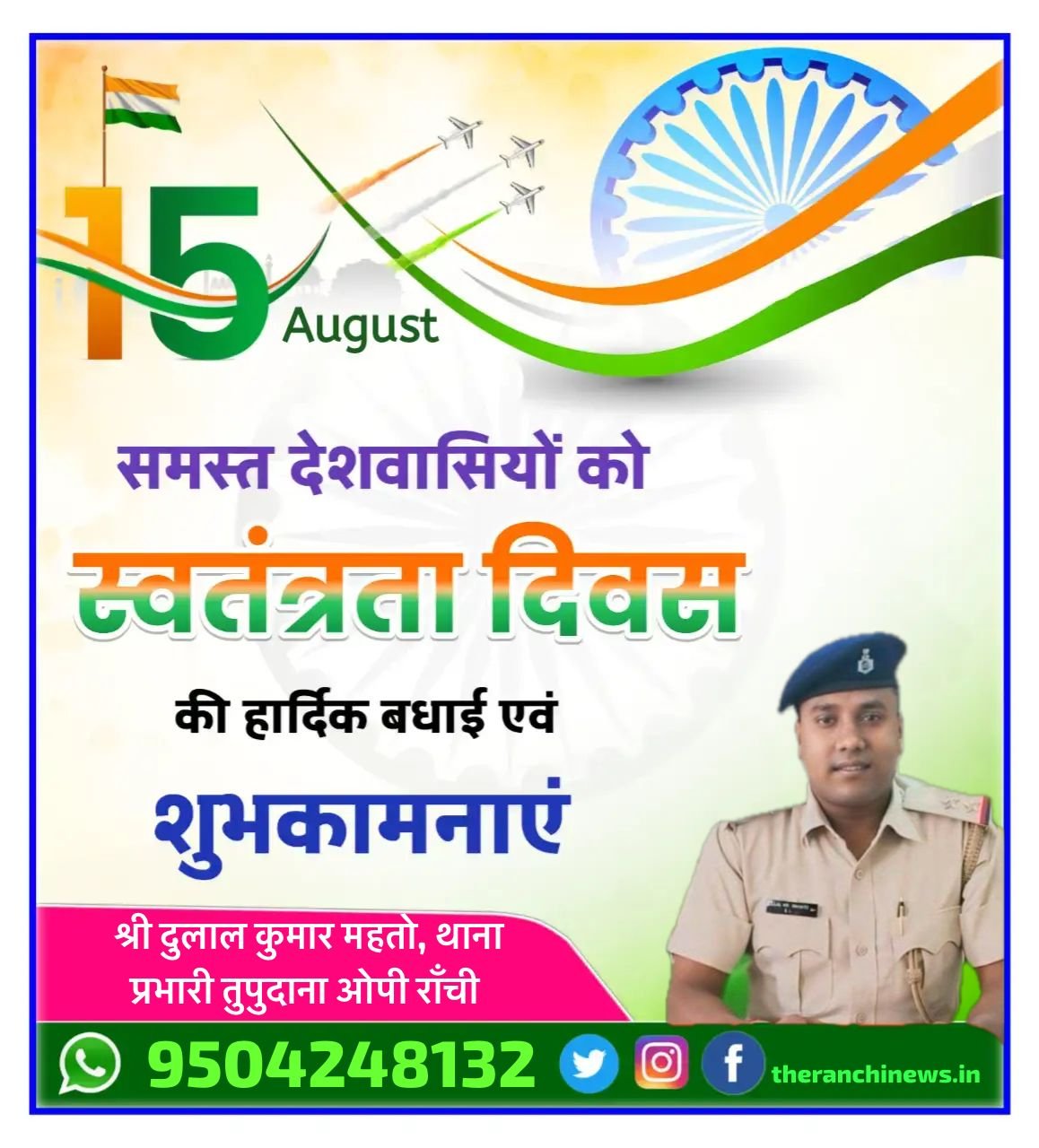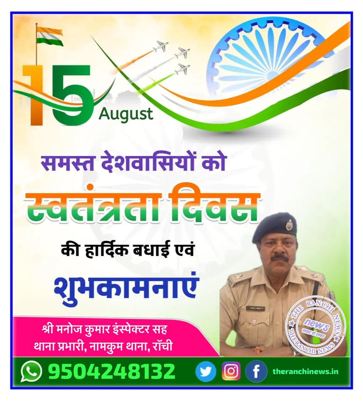 रांची: 15 अगस्त समस्त देशवासियों को स्वतंत्रता दिवस की हार्दिक बधाई एवं शुभकामनाएं- पु०नि० श्री राम नारायण सिंह ,थाना प्रभारी रातु