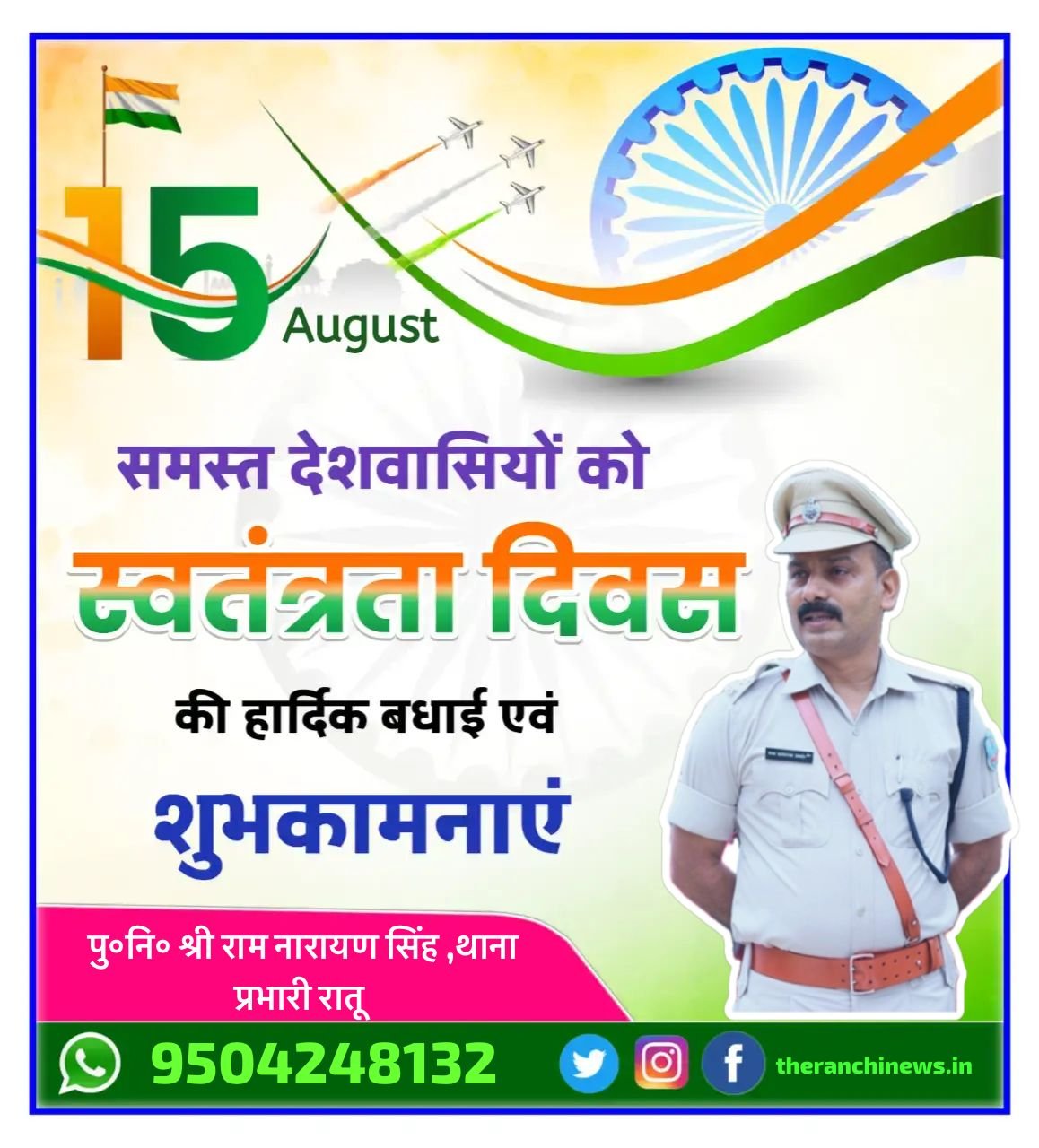 उप विकास आयुक्त रांची, श्री सौरभ भुवनिया ने सभी पदाधिकारी/कर्मियों को स्वतंत्रता दिवस की ढेर सारी शुभकामनाएं दीं । इस खास अवसर पर उन्होंने सभी को अपने देश के लिए बेहतर कार्य करने के लिए प्रेरित किया।